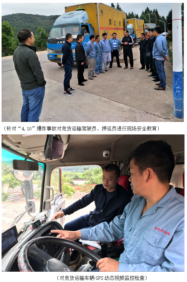 隨后,分公司生產(chǎn)車間、各部門陸續(xù)組織開展“4.10”爆炸事故全員警示教育,總結(jié)吸取事故教訓。4月18日分公司領(lǐng)導、部分管理人員分三個檢查小組對生產(chǎn)區(qū)、總庫區(qū)、特別是涉及到庫房管理、裝卸作業(yè)、運輸作業(yè)的部門進行專項檢查。重點從三個方面進行專項檢查:一是對民爆物品庫管員、裝卸作業(yè)人員警示教育情況進行抽查;二是檢查庫管員持證上崗情況;三是對中達物流玉溪分公司民爆運輸車輛衛(wèi)星定位GPS動態(tài)視頻監(jiān)控系統(tǒng)運行情況、危貨運輸從業(yè)人員資質(zhì)證書、專職押運人員配備情況、人員持證情況、出車前的檢查記錄等進行詳細檢查,對涉爆環(huán)節(jié)的專項檢查實現(xiàn)了“全覆蓋,零容忍”。