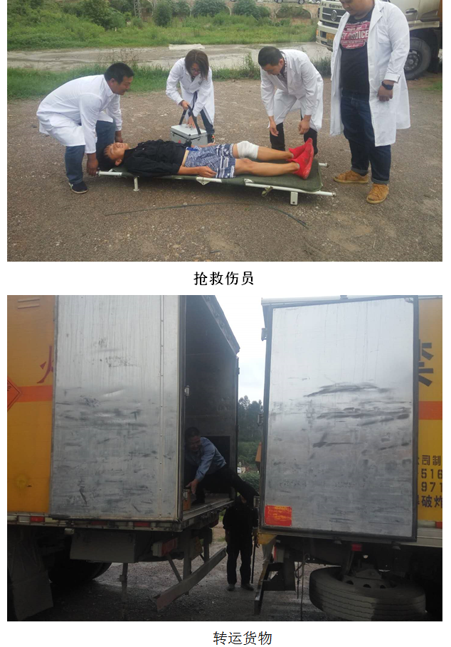 2018年6月22日14時,云南安化中達物流有限責(zé)任公司組織開展以汛期雨季為專題的“安全生產(chǎn)月”應(yīng)急救援。整個演練以雨季彎道行駛致車輛側(cè)滑并與行人發(fā)生擦掛為背景,模擬發(fā)生人員傷害、車輛失控、貨物倒運等環(huán)節(jié)展開的應(yīng)急救援。