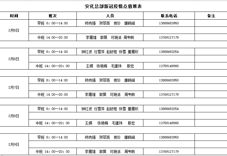 2月5日-2月9日總部職工生活區(qū)疫情防控點值班人員