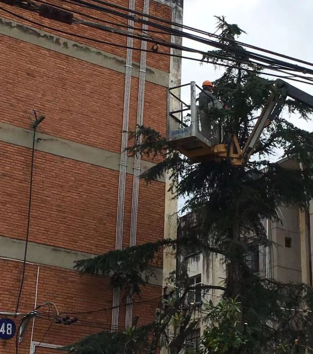 在吱吱吱的電鋸聲中,和供電線路試比高的樹枝一一順勢倒下,還給了它們一個刮風下雨都不怕再被樹枝打擾的安全工作環(huán)境;道路兩旁的行道樹經(jīng)過綠化工作人員的精心修剪,視野開闊了,路過樹下的行人和停放的車輛避免了受到枯枝意外掉落的傷害;上周四下午的暴風雨把脆枝吹斷后砸向92棟通道,連續(xù)幾天住戶們都來物業(yè)辦公室并親自到工作現(xiàn)場反映該情況,工作人員到現(xiàn)場實地查看后,也在此次的工作中一并進行了處理?!斑@下室內(nèi)光線敞亮了,出門放心啦!謝謝你們!”