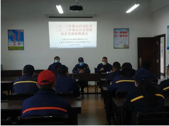 演練開始前,中達(dá)物流公司總經(jīng)理張睿、副總經(jīng)理張金元、安化公司危爆辦主任王現(xiàn)平組織參演人員在中達(dá)會(huì)議室進(jìn)行2023年春運(yùn)啟動(dòng)儀式、春運(yùn)應(yīng)急預(yù)案培訓(xùn)及演練。