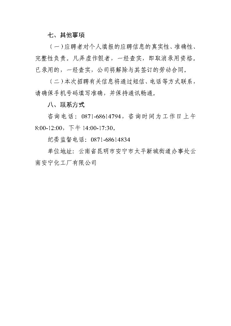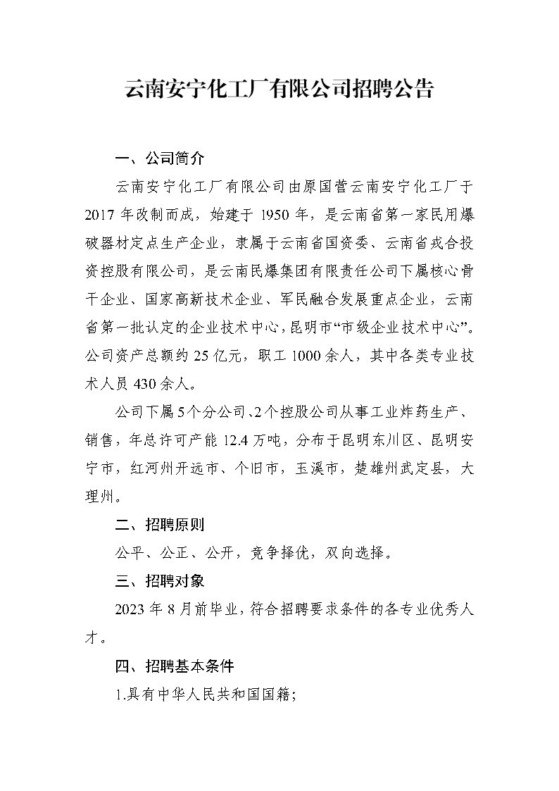 云南安寧化工廠有限公司招聘公告